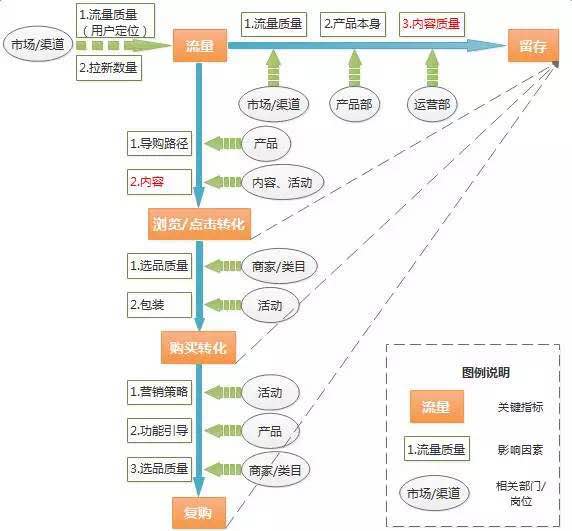 下一步是购买转化,主要影响因素为选品本身质量和营销包装,购买转化还要细分为下单、支付步骤,根据流失率查看哪一环节有待优化,找出影响因素对应到运营同学。