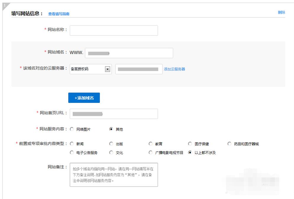 填写你要备案的域名,如果你要备案多个域名的话,这里可以先写一个,后面有更详细的写域名和网站信息的步骤。