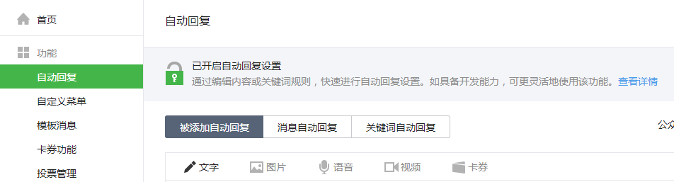 微信公众号本身提供了一些基础的功能,包括在自动回答、自定义菜单。如果自己公众号只是需要这些功能,那可以不用开启微信公众号的第三方系统对接。具体操作如下,在“功能”—“自动回复”里面填写关注回复的内容。