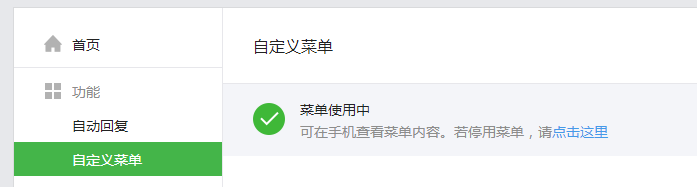 在“功能”—“自定义菜单”里面添加设置对应的菜单内容。这里的菜单是可视化操作添加的。