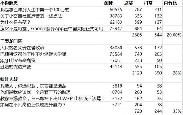 通过这个数据,我们可以推测,一个一两万粉丝的公众号,如果能做到一年更新150篇以上文章,那么获得四五千元以上的打赏,难度并不大。就当零花钱吧。。。