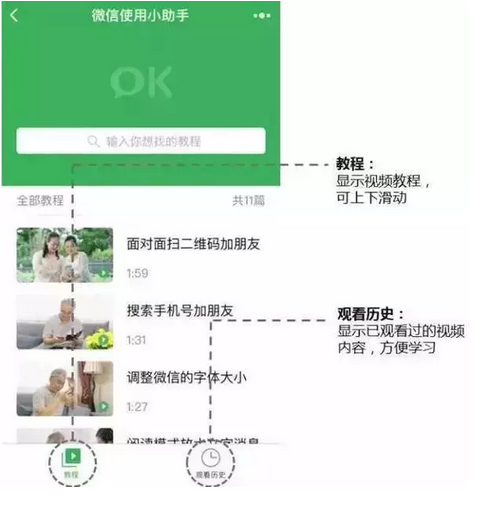 视频教学,真人演示,明了易懂。微信使用小助手目前包含 11 个教程。包括加好友、调整字体、发送图片、发语音、视频 / 语音通话和发表情包等,主要以微信基础沟通功能为主,也是父母最常用的几个功能。每个教程包含 1-2 分钟的短视频和详细的分步骤图文说明。视频由真人演绎,使用口语解说,在关键步骤会突出演示。