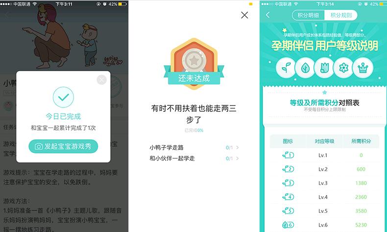 既然是工具类,免不了要引入用户激励手段。在运营方面上,用户每完成一项每日任务,就能获得对应的积分,积分对应的的等级会在自己的个人页面上展示,用户为了获得更高的等级,则会完成系统分配的任务。用户使用母婴APP学会了育儿知识,还获得可以引以为傲的等级标识,当然也就会继续使用APP了。