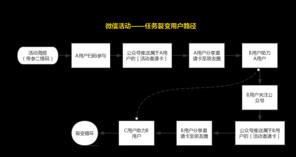 用户路径:裂变海报(活动母码)推送给用户,用户扫码参与会收到公众号消息规则&活动海报图,邀请用户好友扫码接力,完成活动任务,用户就会领取接力奖励,同时活动循环往复。