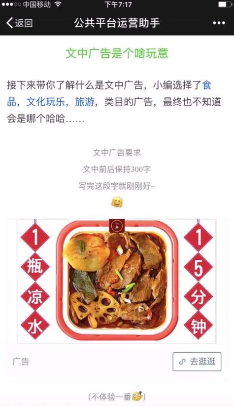 为了帮助电商商家获得更优质流量,微信已经开始测试公众号“文中广告”以前公众号的的广告只能出现再底部,而且是随机出现的,目前一部分公众号已经受到微信的邀请,开始内测该功能,该功能全面上线后,广告主可以根据类目选择自己投放的内容