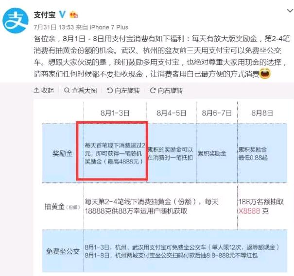 7月31日,支付宝宣布,将从8月1日到8月8日一周时间内,提高支付宝支付的“奖励金”,消费2元以上可能有4888元奖励。