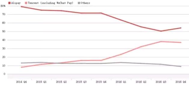 与此同时,支付宝的市场份额也由2014第四季度的79%下降到2016年第四季度的54%。