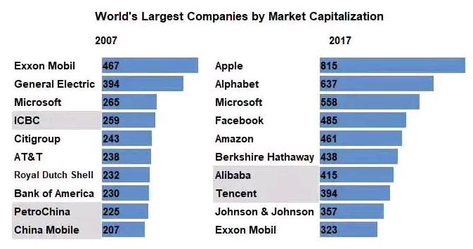 2017 年最新的排名则是 Apple、Alphabet、Microsoft、Facebook、Amazon、Berkshire Hathaway、阿里巴巴、腾讯、Johnson & Johnson(美国强生)、Exxon Mobil(埃克森美孚)。