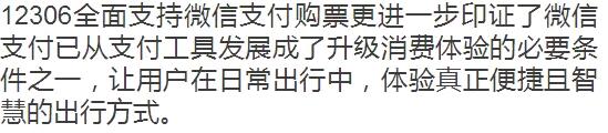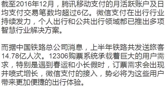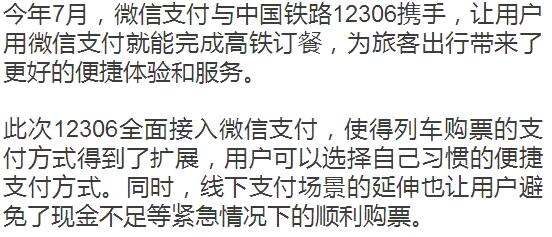近期铁路部门连续也推出了一系列便民措施。今年 7 月份,12306 支持微信支付订餐,今年 10 月,铁路部门推出接续换乘和动车组选座功能,加上购票支持使用微信支付,这些举措也都让乘客感受到了铁路部门满满的诚意。