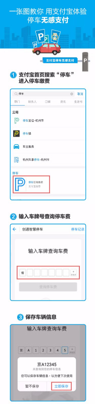 车主只需要在支付宝顶部搜索框输入「停车」进入停车在线缴费,输入车牌号保存绑定后,点击「开通免密」,按指引操作两步就可以开通道路停车无感支付。