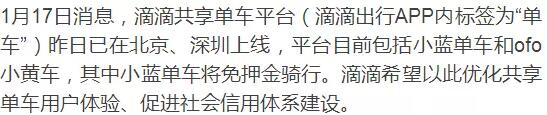 近期滴滴陆续对小蓝单车各地业务进行了托管,用户将可以通过滴滴APP中的“单车”标签再次骑行小蓝单车。【注:需更新至滴滴出行APP5.1.28版】北京深圳是首批城市,经过滴滴维修后的小蓝单车,也将陆续重新回归城市。在滴滴平台进行芝麻信用认证后,用户可以免押金骑行小蓝单车。