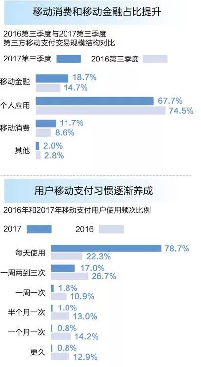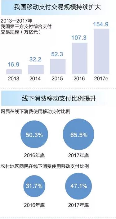 交易规模不断扩大,离不开用户移动支付习惯的养成。中国互联网络信息中心1月31日发布的第四十一次《中国互联网络发展状况统计报告》显示,我国手机支付用户规模增长迅速,截至2017年12月,达到5.27亿,较2016年底增加5783万人。此外,《2017微信数据报告》显示,截至2017年9月,微信支付月社交支付次数较上年增长23%,月线下支付次数较上年增长280%,微信支付绑卡用户已超过8亿。低频次的移动支付用户越来越少。