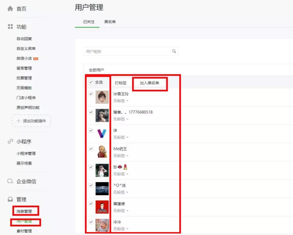 二、第二个方法是点击用户管理,可以批量拉黑或者打标签,方便管理粉丝用户。