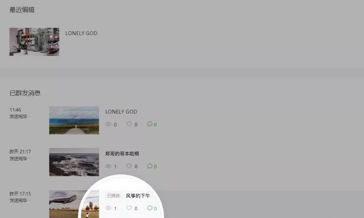 修改完成,在首页已群发列表,可以看到文章状态变更为“已修改”。用户访问文章将看到已更新的内容。文章底部将显示修改时刻。