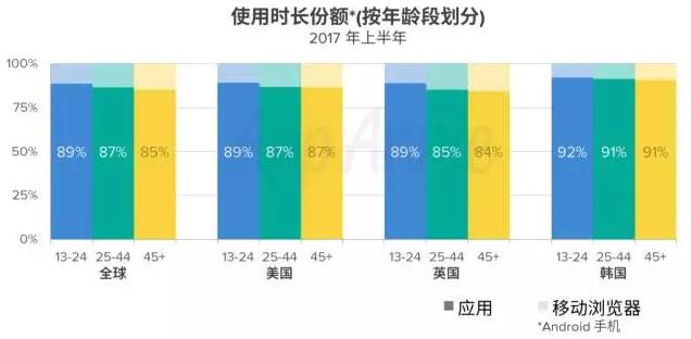 尽管在移动环境中成长的年轻用户可能拥有先天优势,但数据表明,不同年龄用户在 App 和移动浏览器上花费的相对时间基本相同。在全球范围内,13-24 岁用户将 89% 的智能手机使用时间花在 App 上,45 岁以上用户在 App 上的使用时间占比略低,为 85%。在其他成熟市场,这些数字也十分类似:13-24 岁用户将大约 90% 的手机使用时间花在 App 上,年长用户在 App 上的使用时间占比略低。