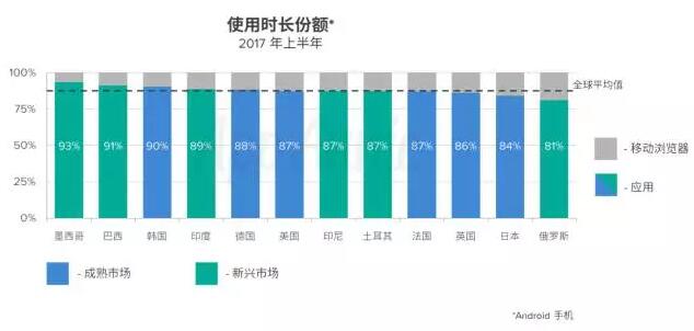 无论哪个国家/地区,用户使用 App 的时间都比移动浏览器要长